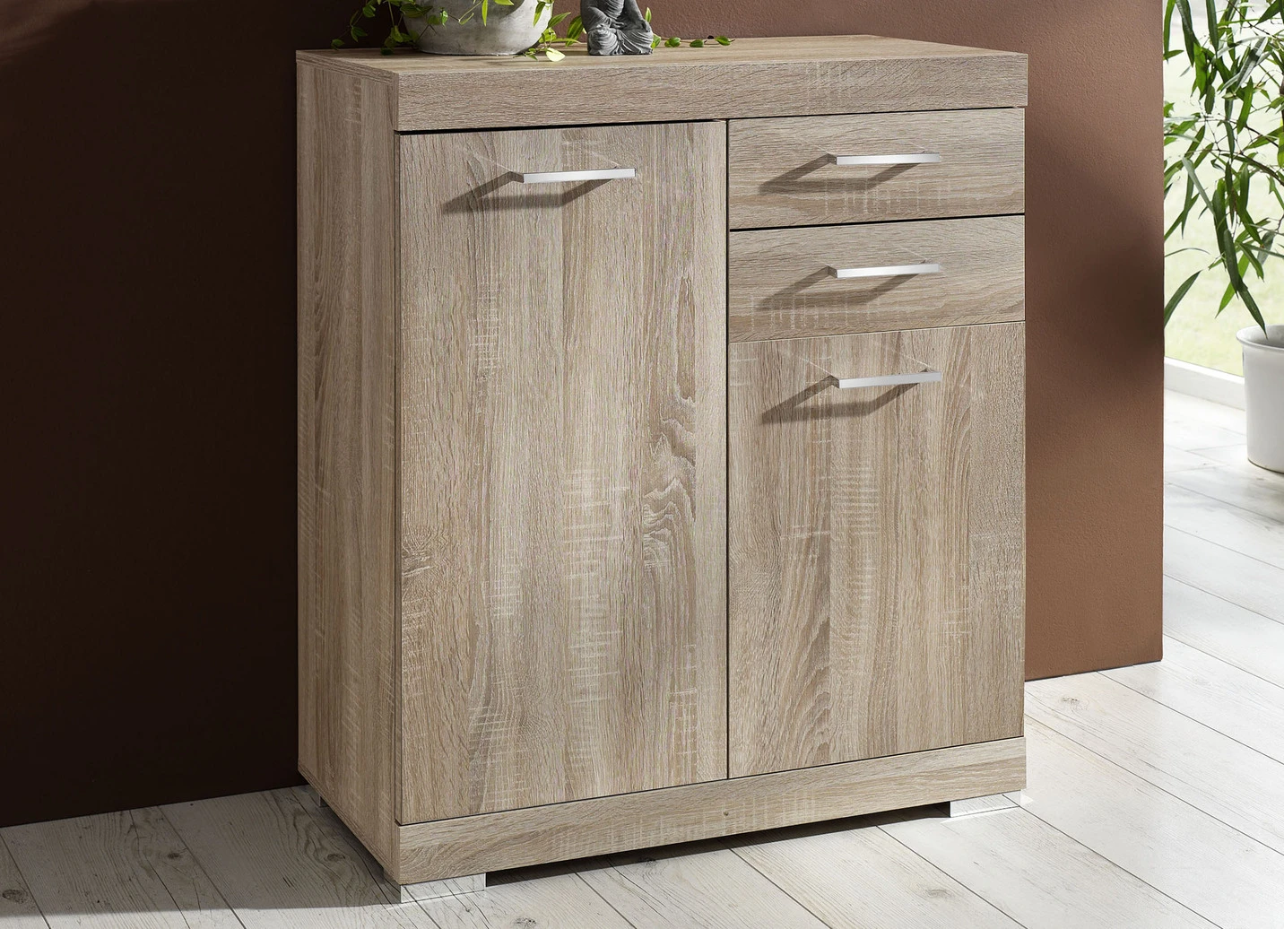Moderne Kommodenserie mit pflegeleichter Melaminbeschichtung in der Ausführung Mit 2 Türen und in Anthrazit-Eiche.