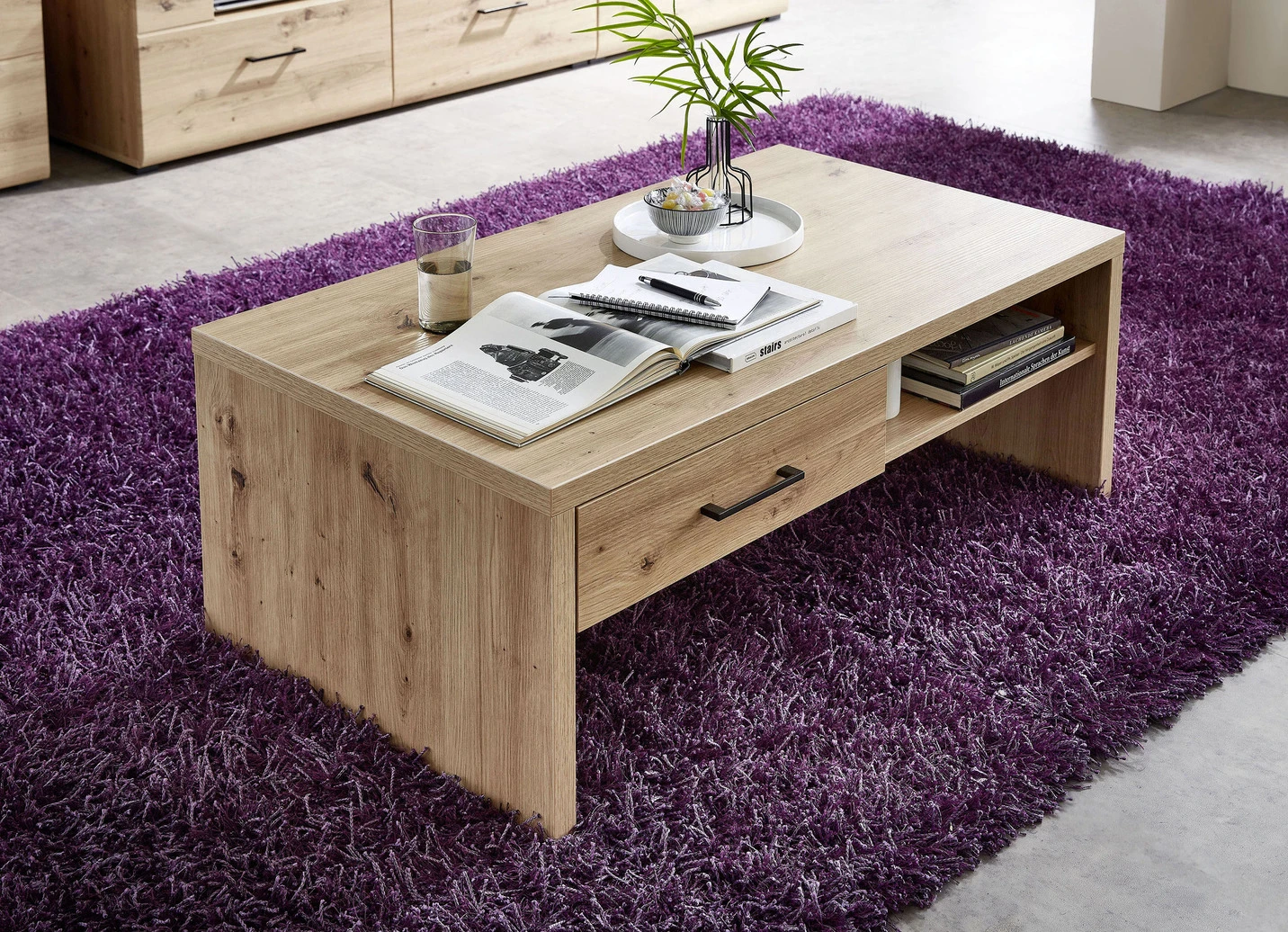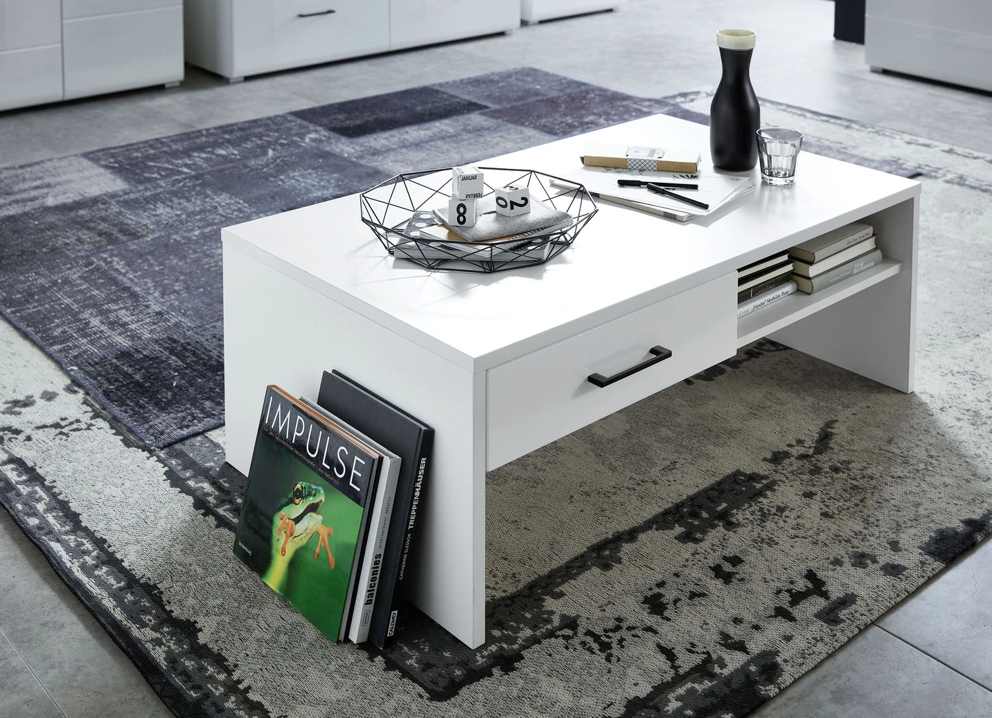 Modern und puristisch im Design und doch ein echter Hingucker für Ihr Wohnzimmer – das ist dieser hochwertige Couchtisch. Zwei praktische Schubladen auf Metallführungsschienen, mit schwarzen Metallgriffen und Selbsteinzug mit Softclose sowie 2 geräumige, offene Fächer (lichte Maße: B53xH14xTT64 cm) bieten viel Stauraum. Auf Kunststoffgleitern. Maße: B110xH40xT65 cm. Mit Aufbau Anleitung.