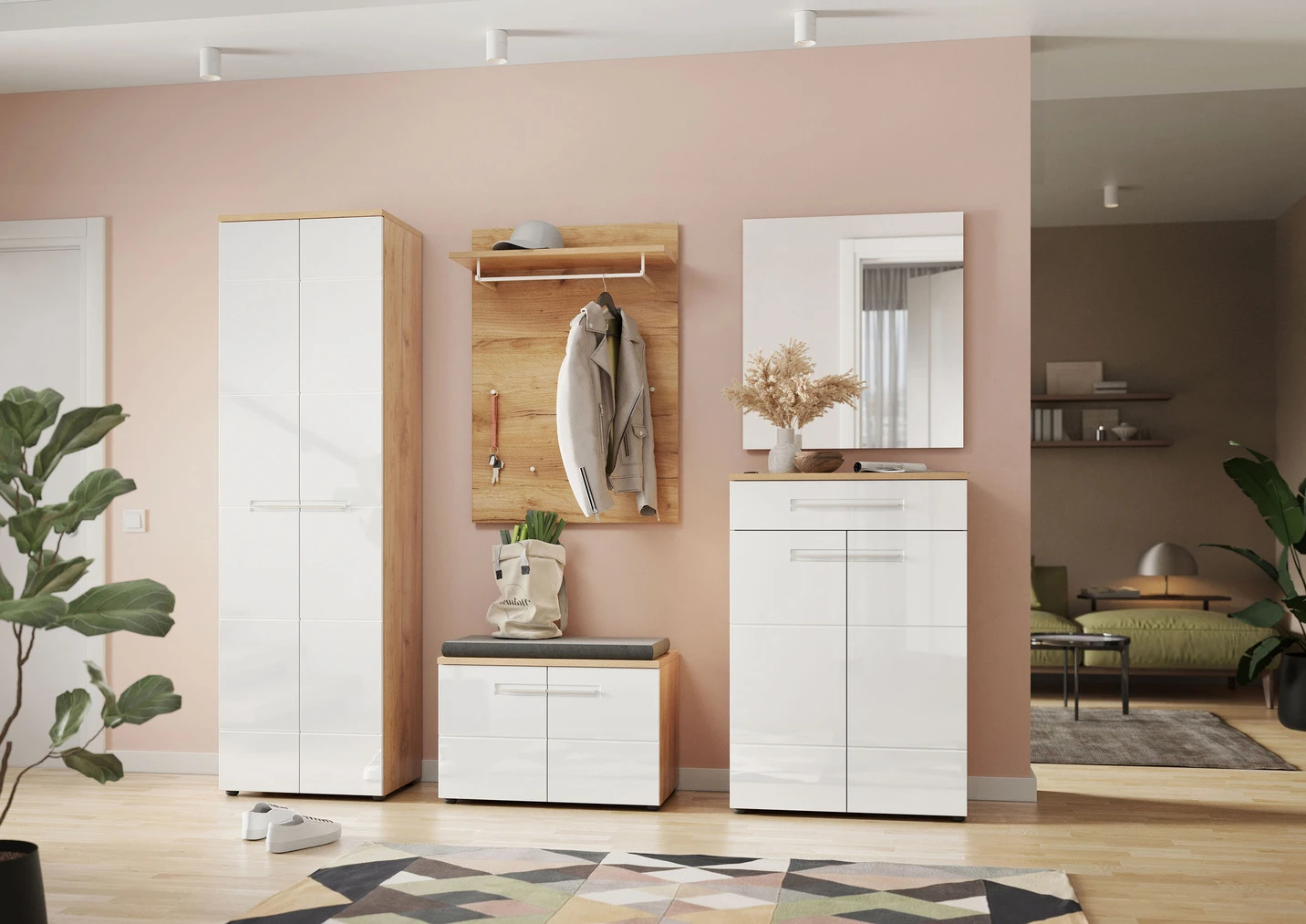 Modernes Garderoben-Programm in der Ausführung Spiegel und in Eiche-Weiss.