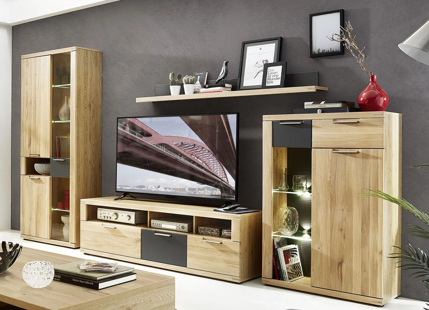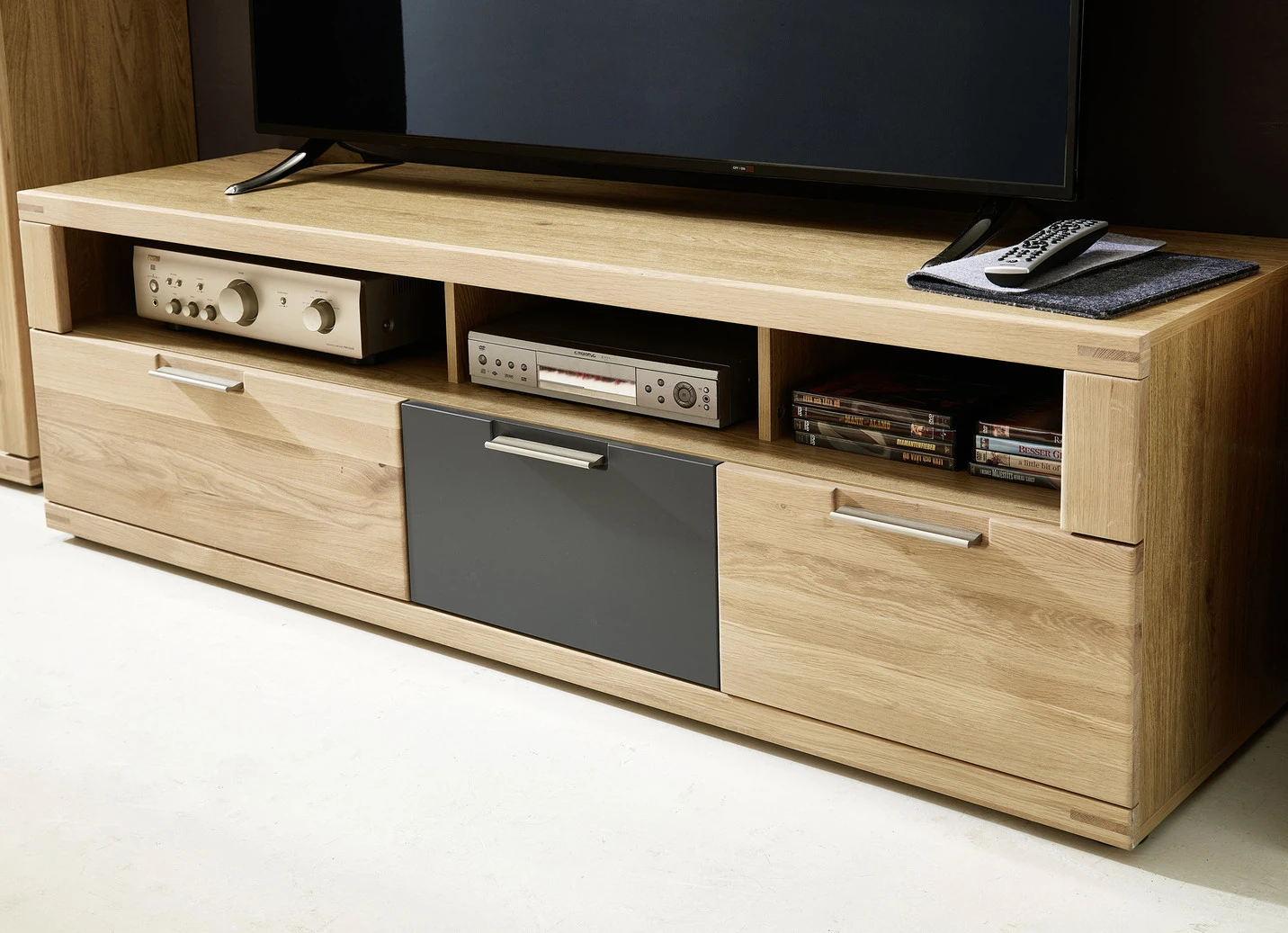Möbelserie mit Massivholz-Fronten in der Ausführung Wandboard und in W.Eiche-Graphit.
