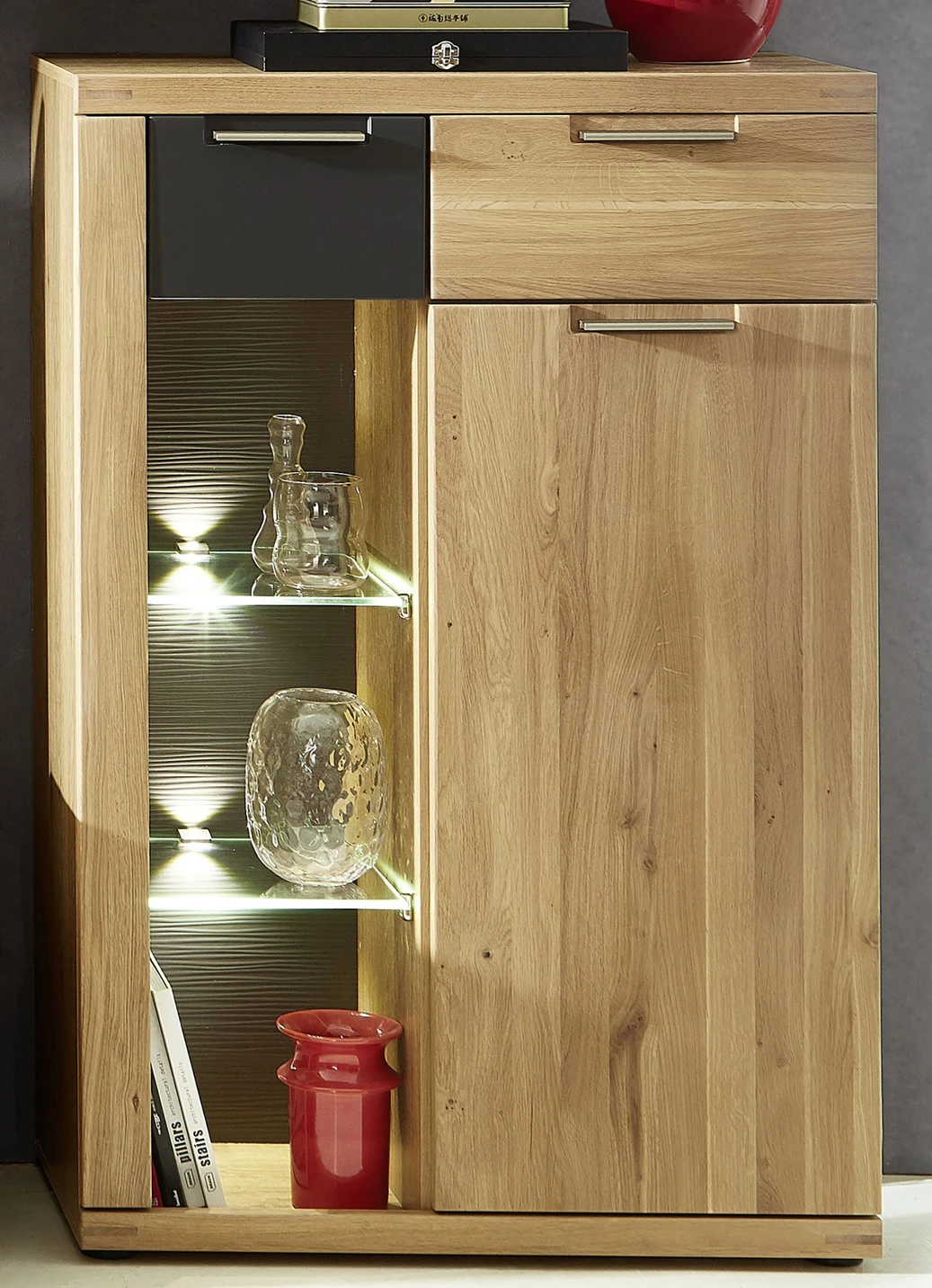 Zeitlos elegante Möbelserie mit besonders schönen Massivholz-Fronten in Wildeiche Bianco mit durchgehender Lamelle, Korpus in Wildeiche Bianco Nachbildung sowie Absetzungen und strukturierten Rückwänden in Graphit. Der Clou ist die tolle LED-Beleuchtung in den Vitrinen (Leuchtmittel fest verbaut, nichtaustauschbar). Alle Schubladen mit Selbsteinzug und Softclose ausgestattet. Türen mit Softclose. Mit Metallgriffen, Aluminium gebürstet. Auf runden, schwarzen Kunststoffgleitern. Mit Aufbau-Anleitung zur einfachen Selbstmontage