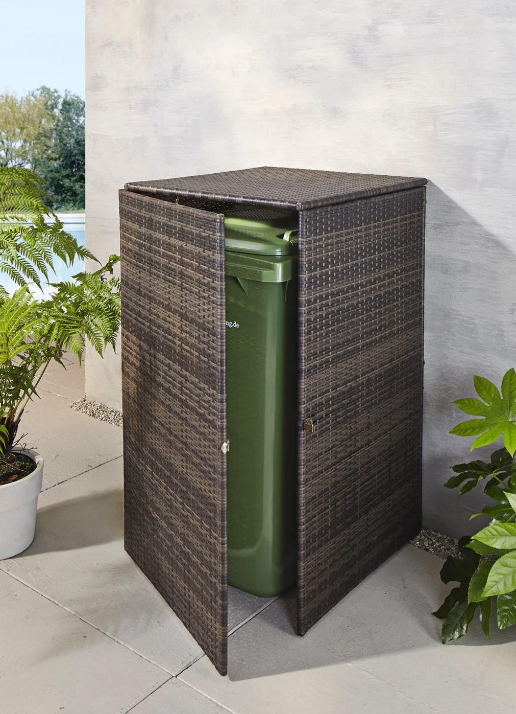 Mülltonnenschrank aus witterungsbeständigem Kunststoffgeflecht in der Ausführung klein und in Braun.