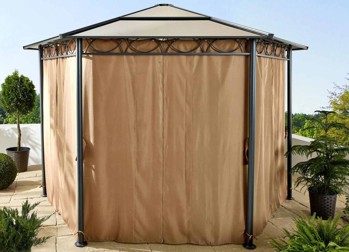 Edel und geräumig bildet dieser 6-eckige Pavillon den Mittelpunkt Ihres Gartens und beeindruckt mit seinem imposanten Erscheinungsbild! Stahl-Gestell mit Dachstreben aus Aluminium, Dach aus Polycarbonat, daher ganzjahres tauglich. Die im Lieferumfang enthaltenen Seitenteile aus Polyester können im Hand umdrehen geöffnet oder geschlossen werden. Mit Aufbau- Anleitung.