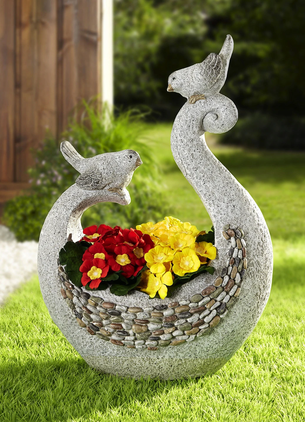 Anmutig und zart wirken die beiden Vögelchen auf dieser mit Mosaiksteinchen verzierten Pflanzschale aus wetterfestem Kunststein. Hier haben Blumen, Pflanzen oder Kräuter Platz. Gleichzeitig ist die Pflanzschale auch ein wunderschönes Deko-Element.