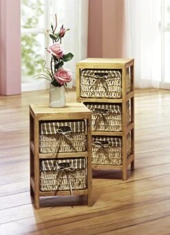 Regale aus massivem Holz, mit schön sichtbarer Holz-Struktur auf der Oberfläche sowie Körben aus Mais Stroh-Geflecht, die mit einem braun-beige gestreiften Stoff-Einsatz ausgekleidet sind, 80% Polyester und 20% Baumwolle. Die Lieferung erfolgt aufgebaut