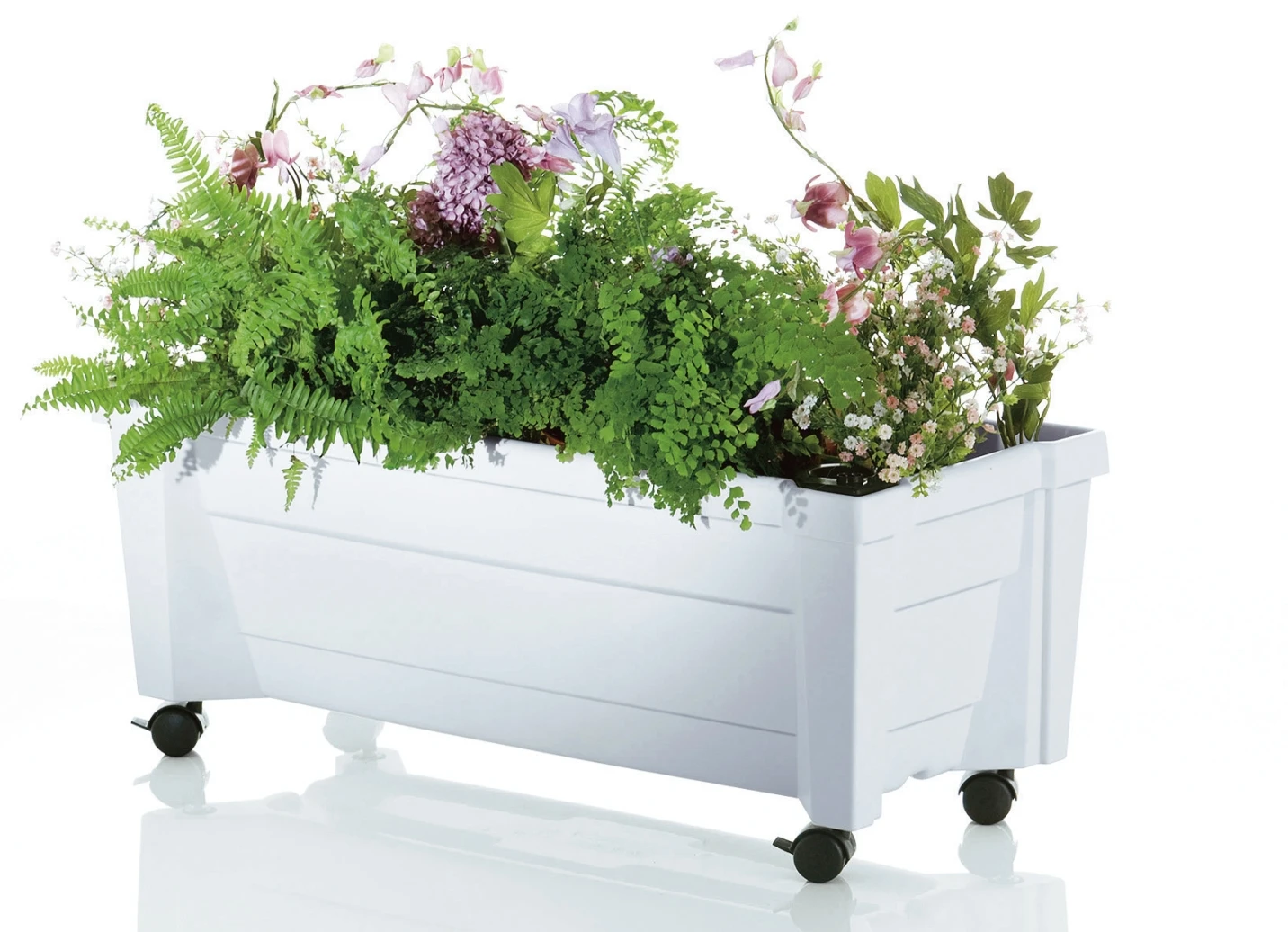 Vier Rollen machen diesen Pflanzkasten zum idealen Gestaltungselement. Und sein 8-Liter-Wasserreservoir mit Wasserstandsanzeige und Überlaufschutz erspart Ihnen das regelmäßige Gießen – ideal, wenn Sie verreisen.