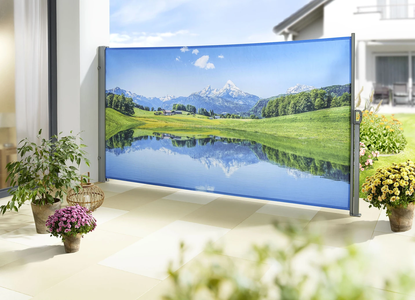 Seitenmarkise aus Aluminium und Stahl in der Ausführung Bergsee.