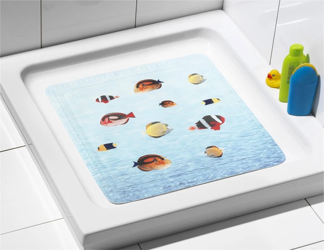 Mit lustigen Fisch-Motiven zeigen sich diese farbenfrohen Accessoires von Kleine Wolke, die für höhere Sicherheit beim Duschen und Baden sorgen. Aus 100% PVC. Waschbar bis 40 ºC.
