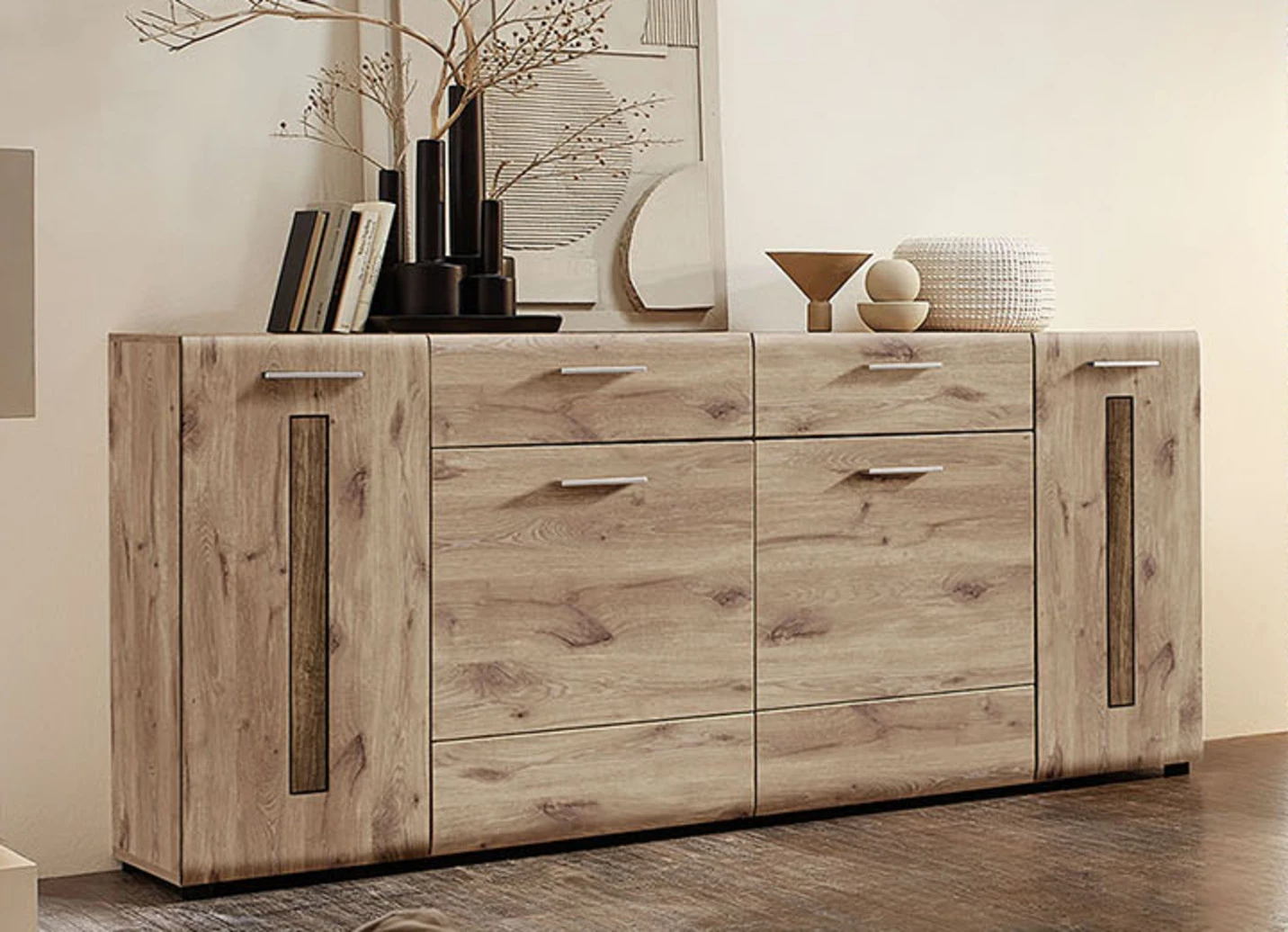 Sind Sie auf der Suche nach einem neuen, zeitlos schönen Herzstück für Ihre Wohnzimmer-Einrichtung? Dann werden Sie von diesem hochwertigen Sideboard mit den modernen, profilierten und gerundeten MDF-Fronten absolut begeistert sein. Die Farbgebung in Eiche Natur mit Absetzungen in Eiche Dunkel ist perfekt mit anderen Möbeln zu kombinieren. Alle Schubladen sind mit Selbsteinzug und Softclose ausgestattet, Türen mit Softclose. Die Griffe sind aus silberfarbenem Kunststoff. Die Lieferung erfolgt aufgebaut (lediglich einfache Endmontage von Griffen, Beleuchtung und Einlegeböden).