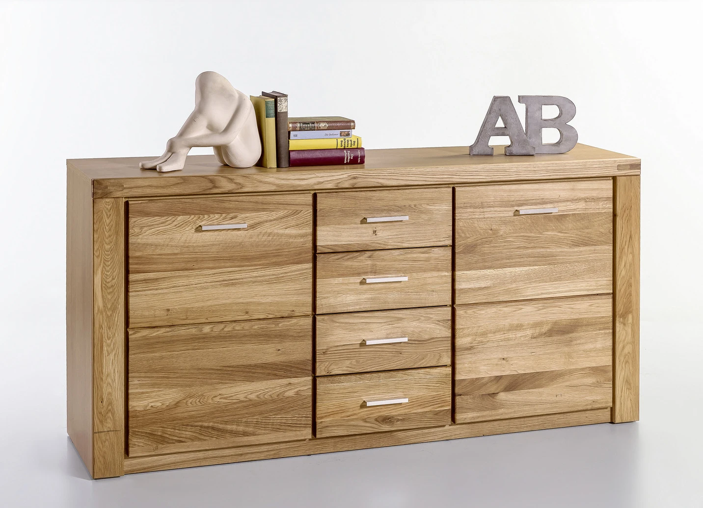 - Sideboard. Mit Massivholzoberplatte, 2 Türen, 2 Einlegeböden, in der Mitte 4 Schubladen. Maße: B159xH82xT40 cm