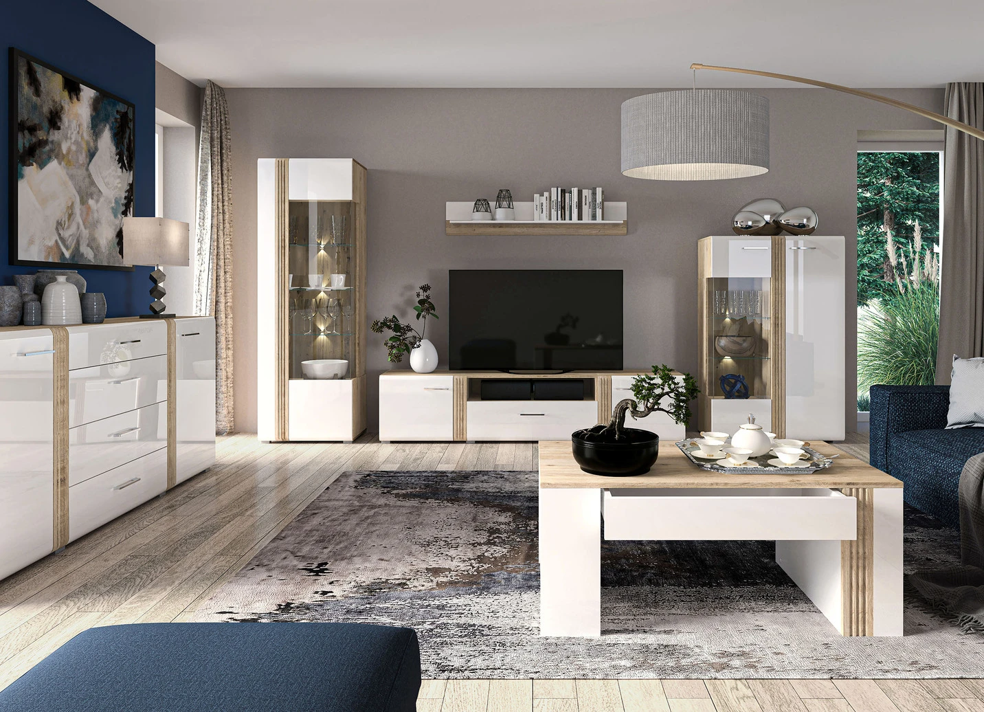 Sideboard mit MDF-Fronten in Weiß Hochglanz, Korpus und Einfassungen in Eiche. Mit Metallgriffen. Schubladen auf Metallführungsschienen. Türen mit Softclose. Mit Aufbau-Anleitung