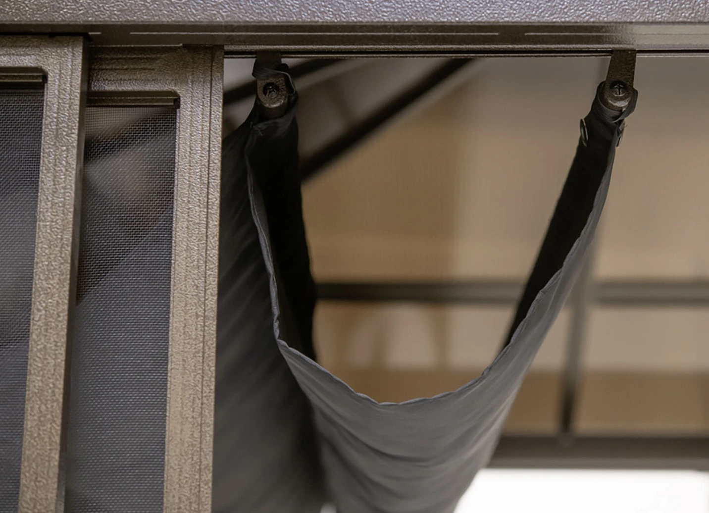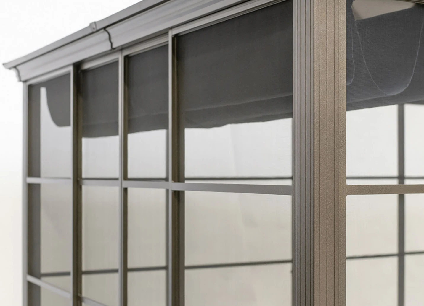Der SOJAG Aluminium Pavillon Castel in edlem Bronzeton besticht mit Langlebigkeit und toller Optik. Das Dach aus 8 mm starken Doppelstegplatten aus Polycarbonat trägt außerwöhnliche 125 kg/m² Schneelast, ist wasserdicht und hält allen Witterungsbedingungen problemlos Stand. Dies gilt gleichermaßen für die stabile Konstruktion aus resistentem, pulverbeschichtetem Aluminium (Pfostenstärke 7,6 cm) und die Schrauben aus rostfreiem Edelstahl. Der Pavillon muss daher im Winter nicht abgebaut werden. Besonders praktisch sind die mit Aluminium verstärkten Moskitonetze, die den Pavillon rundherum umgeben und die großen Doppel-Schiebetüren an allen Seiten.