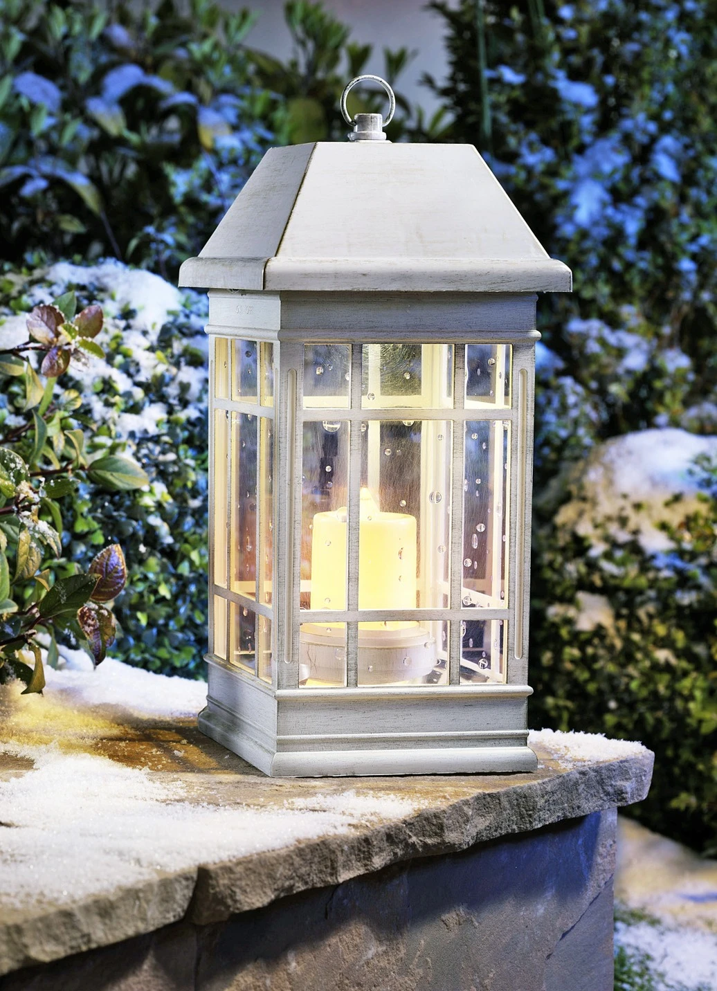Aus pulverbeschichtetem Metall in Antik-Weiß gefertigt. Mit Tageslicht-Sensor und Ein- und Ausschalter.