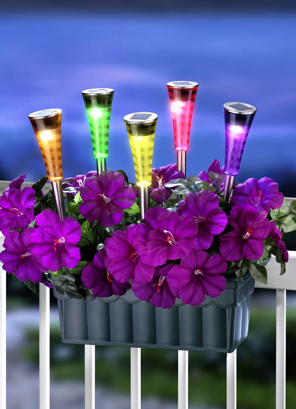 Mit ihrem bunten Lichtschein bereichern diese Solar-Steckleuchten Terrasse, Balkon oder Garten. Das Set besteht aus jeweils einer gelben, grünen, roten, violetten und orangefarbenen Leuchte mit integriertem Solarpanel und Erdspieß.