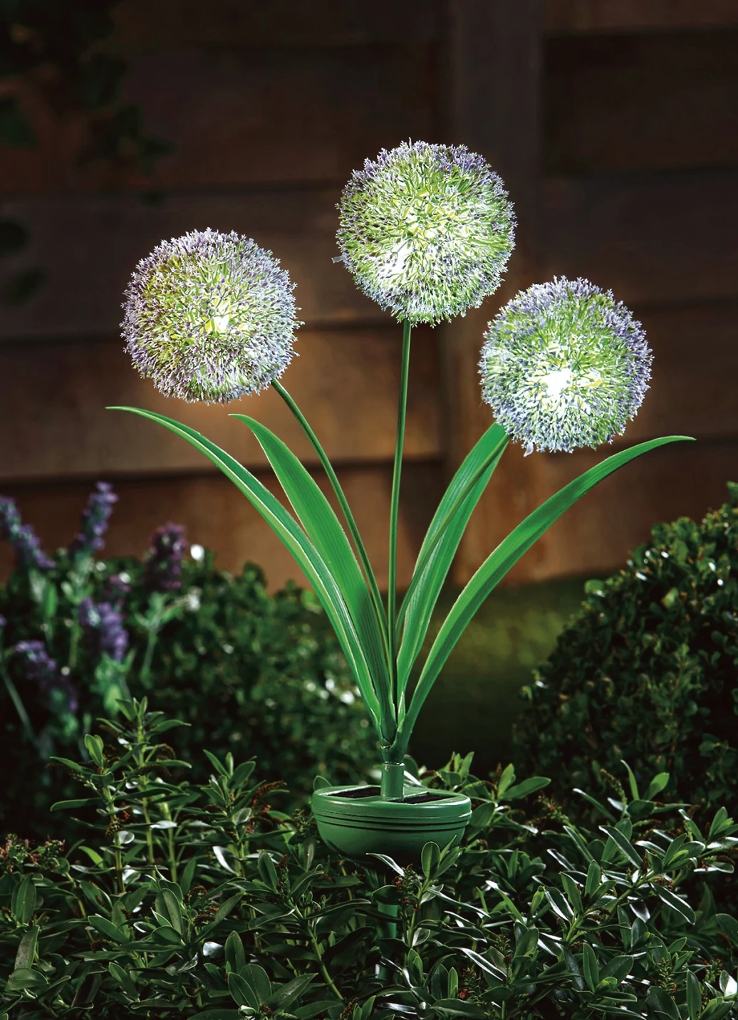Diese Solarleuchten mit 3 runden Blüten wirken täuschend echt. Allerdings brauchen sie keine Pflege, sondern erfreuen Sie jeden Abend mit wunderschönem Licht. Am Tage sammelt das Solarmodul Sonnenenergie, abends gibt es das Licht automatisch wieder ab.