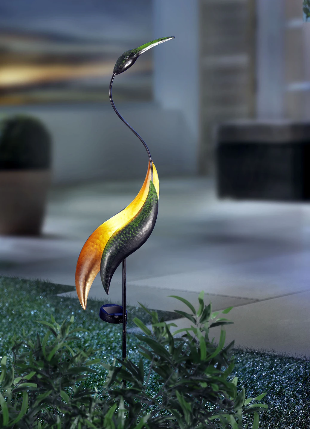 Modern interpretierter Gartenstecker in Form eines Kranichs. Die Ausführung und abstrakte Form setzen ganz neue Akzente und ziehen garantiert alle Blicke auf sich. Nach Einbruch der Dämmerung beginnt der Körper des Vogels dank Solartechnik sanft zu leuchten. Aus Metall gefertigt.