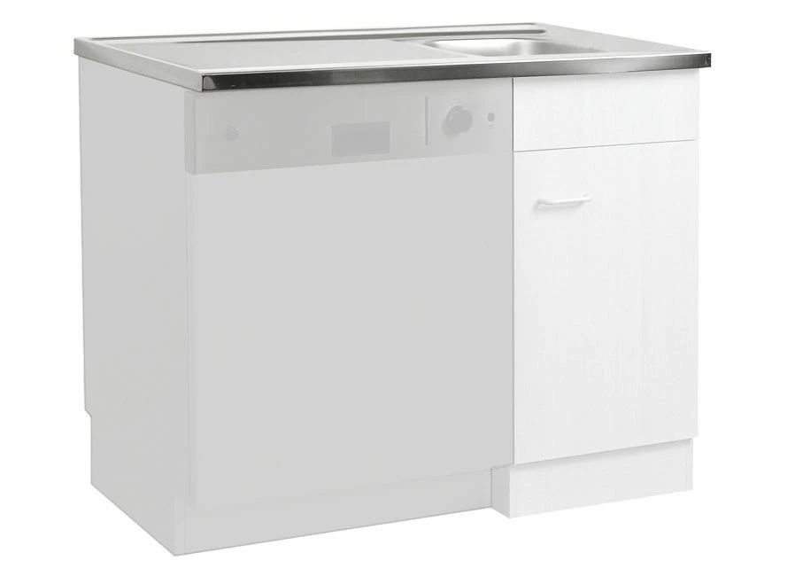 Spülenschrank in 2 Dekors, mit melaminharzbeschichteter Oberfläche. Mit 1 Tür, Becken und Überlauf aus Edelstahl sowie 1 Nische für Unterbau-Geschirrspüler.