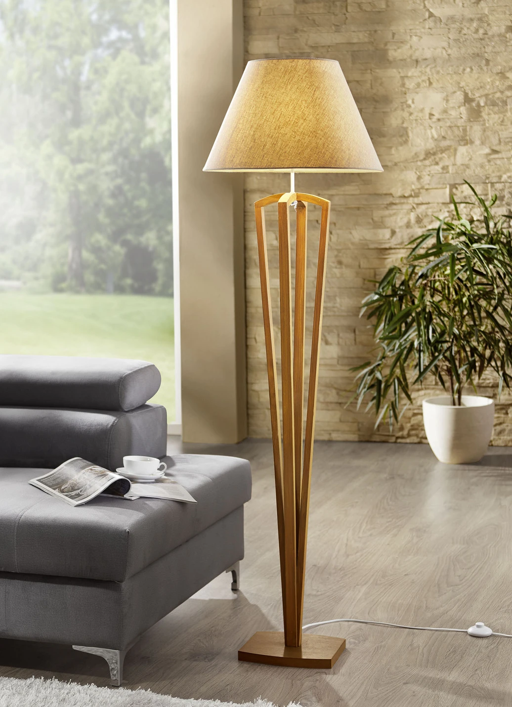 Ein Design-Highlight ist diese tolle Stehleuchte mit Fuß und Bodenplatte aus massivem Eichenholz. Der Lampenschirm ist aus 100% Leinenstoff. Fassung 1x E27, max. 40 Watt, 230 Volt. Lieferung ohne Leuchtmittel.