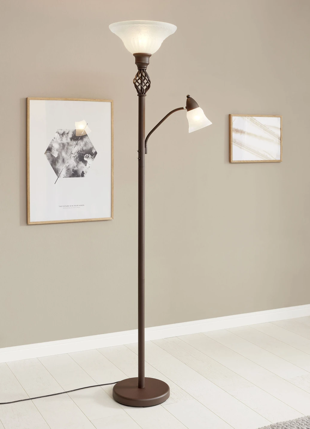 Stehleuchte aus Metall mit Glasschirmen in Rost.