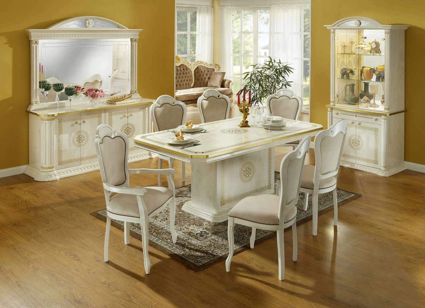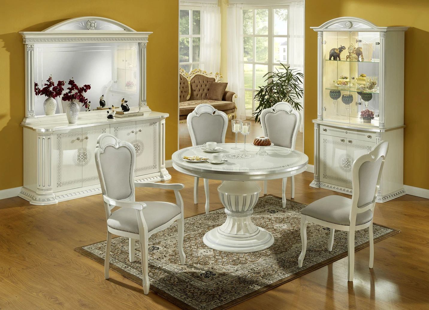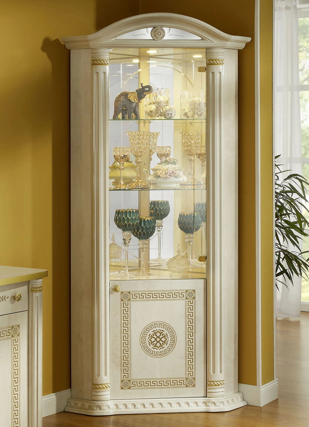 Glastüren und Spiegel mit Facettenschliff, Metallgriffe mit Kunststeinen, geschwungenem Sockel, Schubladen auf Metallleisten. Vitrinen mit Spiegelrückwand und fest verbauten LED-Leuchtmitteln (2 Watt, nicht austauschbar) und Spiegeleinsatz im Kranz.