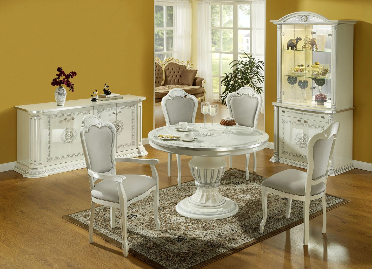 Stilvolle Möbel mit hochglanzlackierter Kunststoffoberfläche aus melaminbeschichteter Spanplatte – in Beige-Gold mit goldfarbenen, in Weiß-Silber mit silberfarbenen Verzierungen und Aluminium Umrandungen.