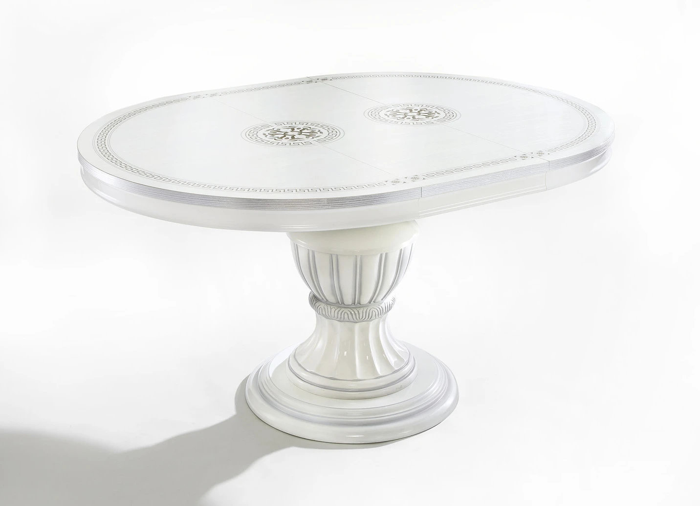 Stilvolle Möbel mit hochglanzlackierter Kunststoffoberfläche in der Ausführung Couchtisch und in Weiss-Silber.