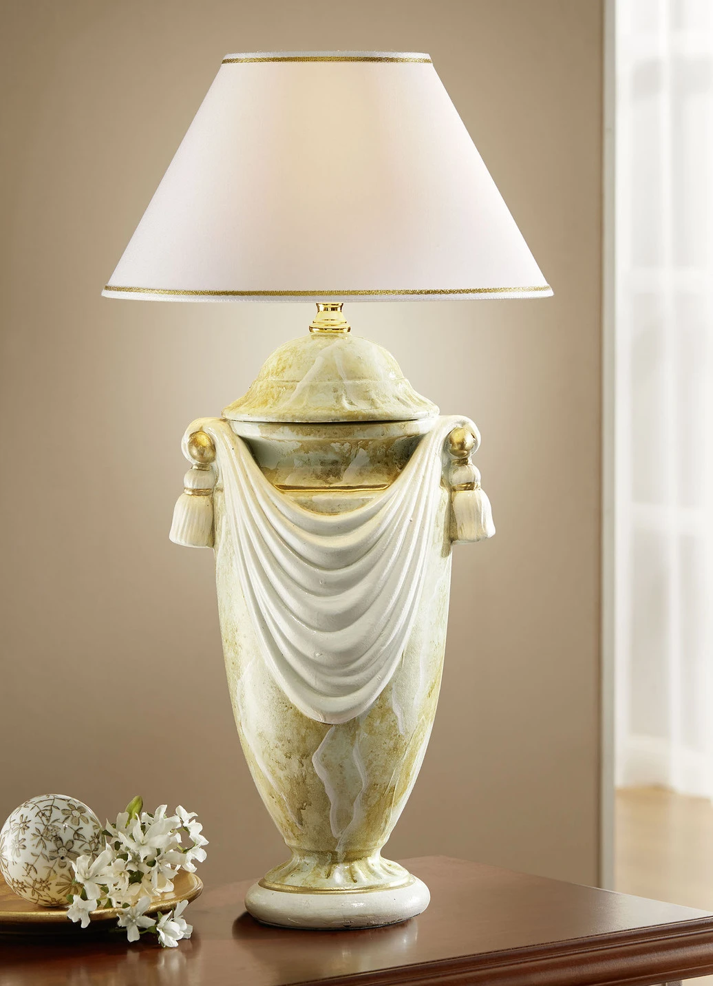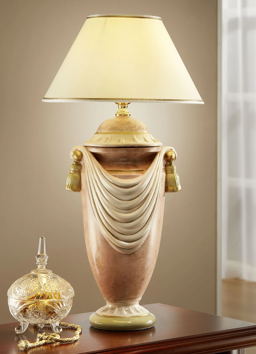 Geradezu royale Akzente setzen Sie mit dieser dekorativen Tischleuchte, die ein typisch italienisches Flair in Ihrem Wohnraum verbreitet. Aus hochwertiger Keramik von Hand gefertigt und handbemalt. Schöner Stofflampenschirm mit goldfarbenem Rand (80% Baumwolle und 20% Polyester). 1x E27, max. 57 Watt, 230 Volt.