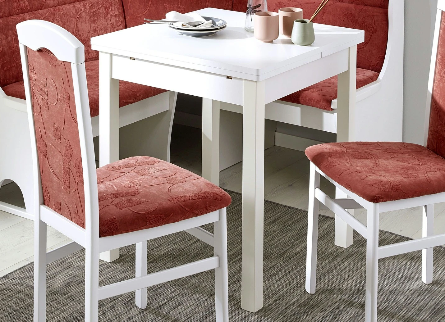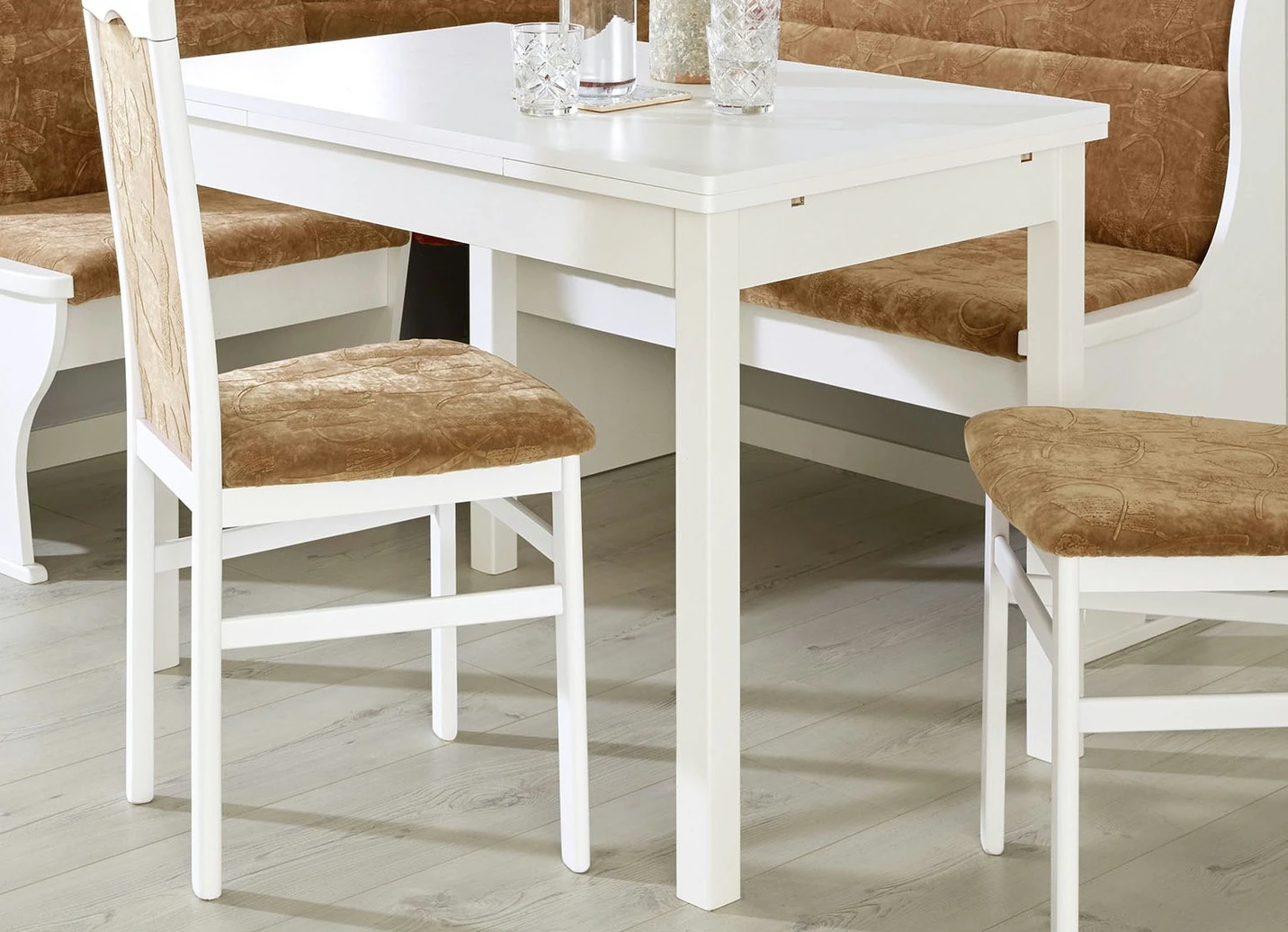 Stilvoller Esstisch mit pflegeleichter Melamin-Oberfläche in der Ausführung Esstisch, klein und in Weiss.