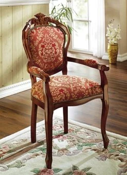 Stühle mit Schnitzereien und massivem Buchenholzgestell in der Ausführung Armlehnenstuhl und in Bordeaux Gemustert.