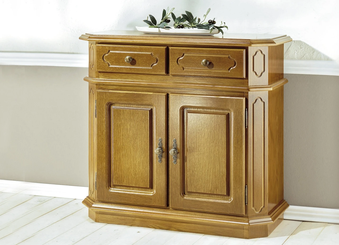 Teilmassives Möbelprogramm in Eiche-Rustikal. Mit dekorativen Metallgriffen. Die Lieferung erfolgt aufgebaut