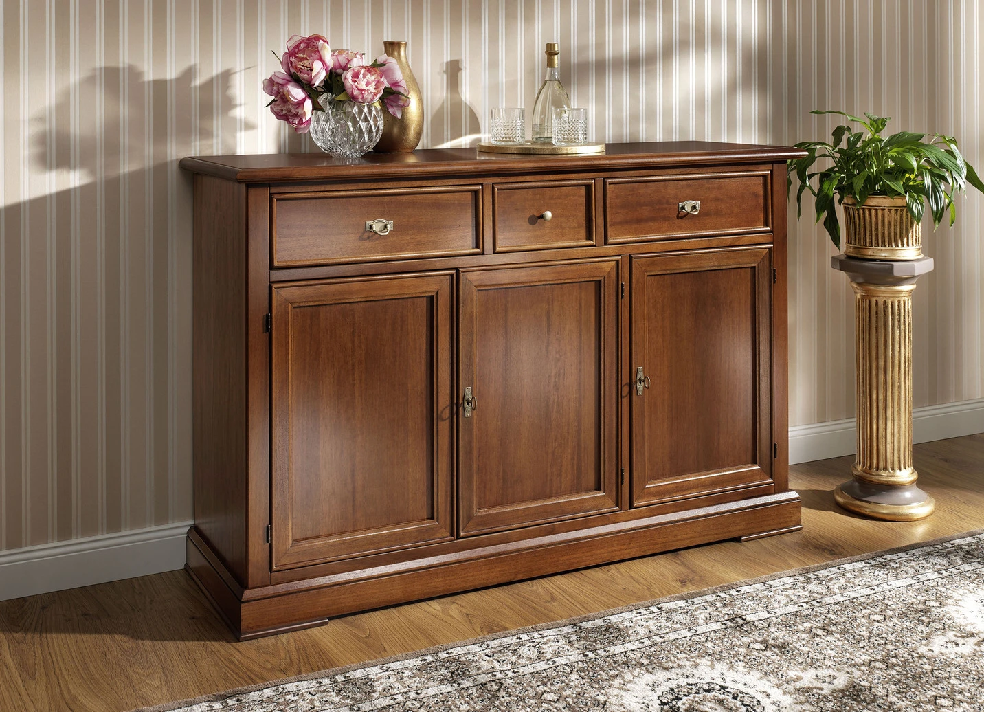 Sehr edel und perfekt für Ihren klassischen Wohnraum ist diese hervorragend zeitlose, teilmassive Kommode in der wohnlichen Farbe Nussbaum! Mit Echtholzfurnier, aufwendig gestalteten, goldfarbenen Metallgriffen und kunstvollen Verzierungen auf den Tür- und Schubladenfronten gefertigt. Die Türen sind jeweils abschließbar. Die Lieferung erfolgt aufgebaut