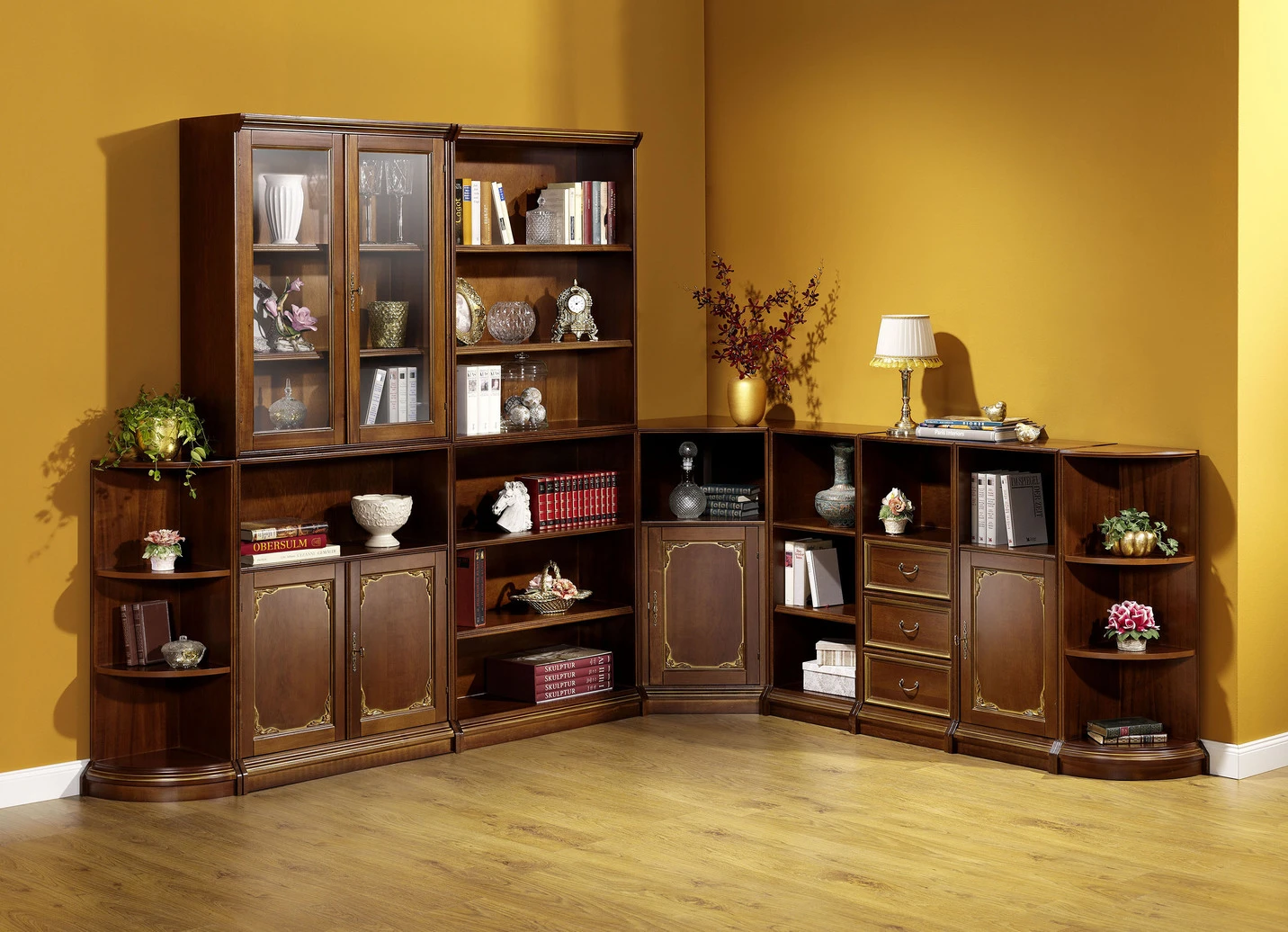 Teilmassive Möbel mit goldfarbenen Verzierungen in der Ausführung Abschlussregal und in Nussbaum-Gold.