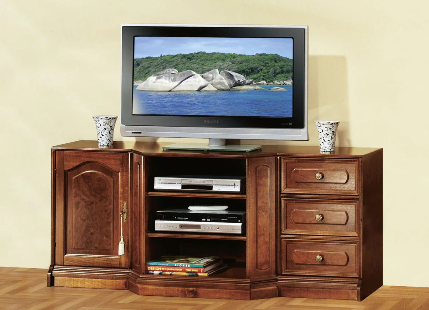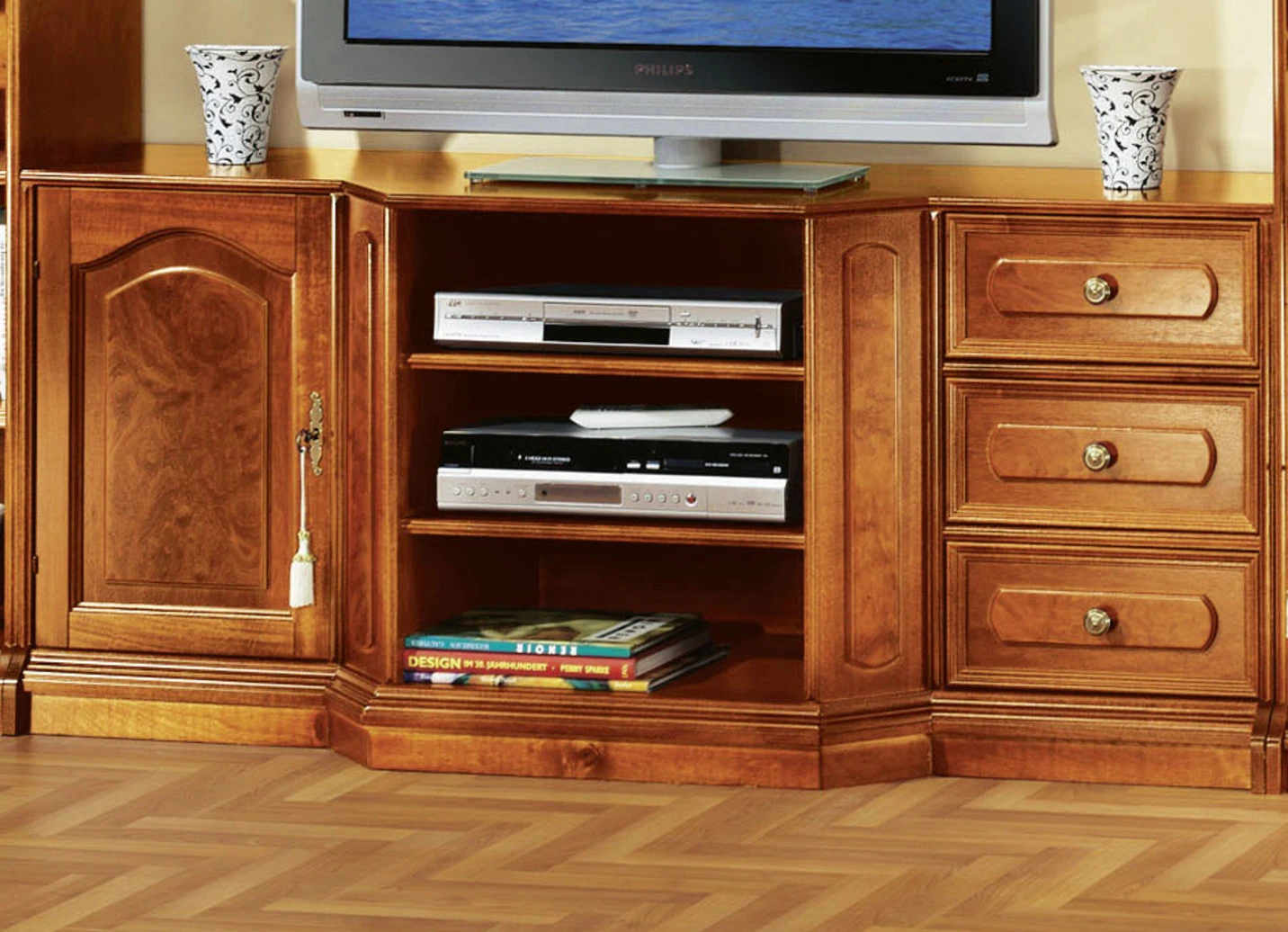 TV-Longboard mit Erker: Links 1 Tür, dahinter 1 fester Boden. In der Mitte Erker und 1 Fach (B50xH33xT38 cm) mit 2 festen Böden. Rechts 3 Schubladen. Die Maße: B157xH67xT42 cm