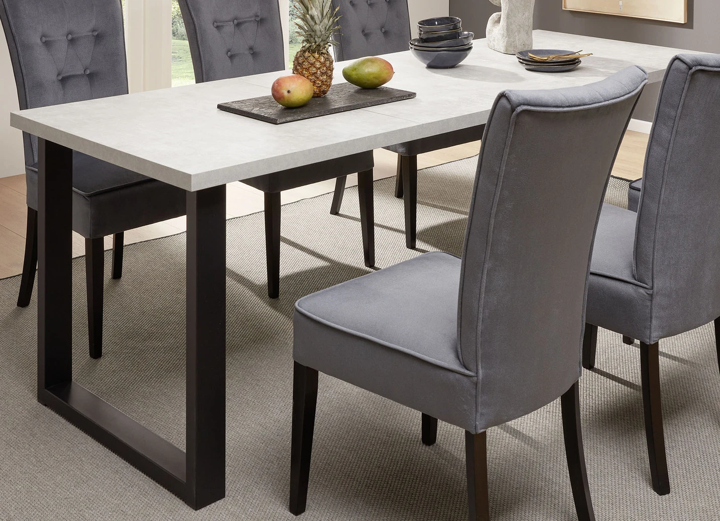 Tisch mit Auszug und Metallkufe in Beton-Schwarz.