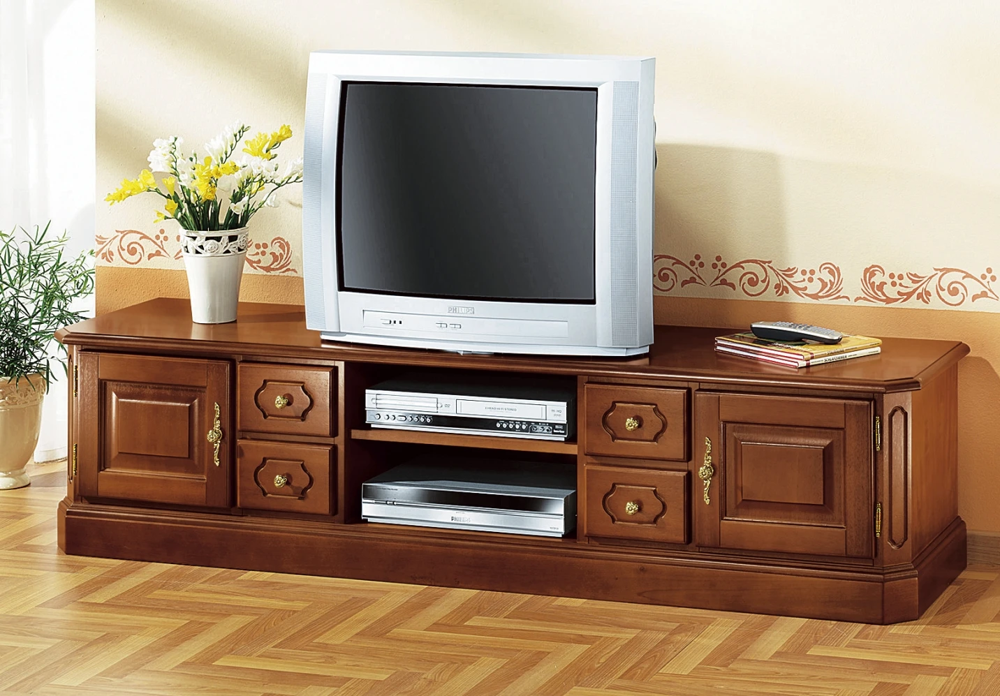 Stilvolles, teilmassives TV-Long-Board, wahlweise in Nussbaum- oder Kirschbaumdekor. mit eleganten, goldfarbenen Metallgriffen. Lieferung erfolgt aufgebaut.