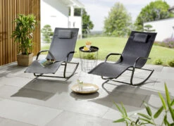 Das freischwingende Gestell aus pulverbeschichtetem Stahl federt sanft, die bequeme Liegefläche aus nachgiebigem, UV-beständigem Textilen (mit weichem Kopfkissen) sorgt für traumhafte Entspannung. Komfortabel, praktisch und witterungsbeständig. Die Kufen haben bodenschonende Gummipuffer.