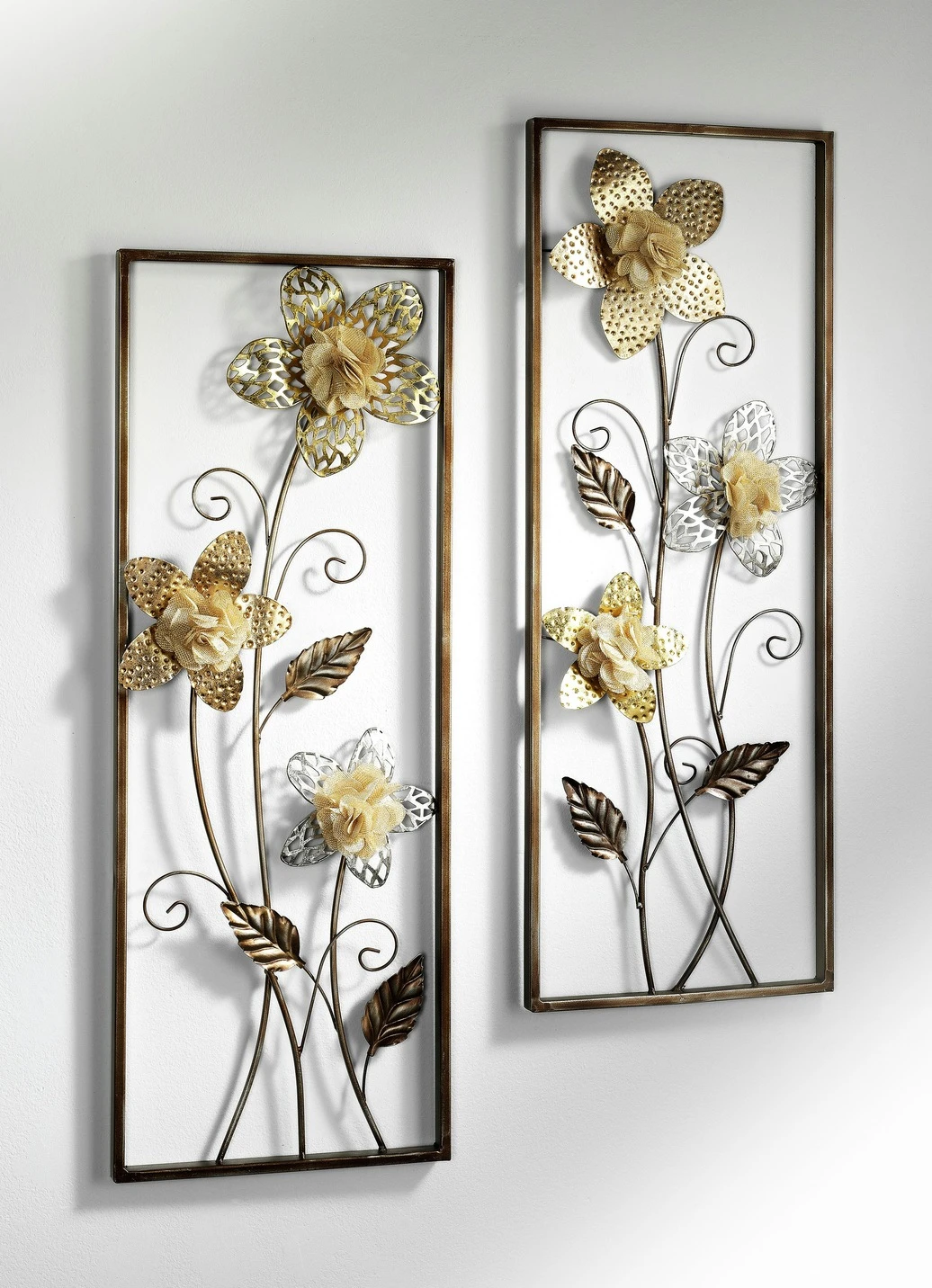 Diese schöne Wanddekoration im 2er-Set mit antikem Finish wurde aus Metall gefertigt. In dem schwarz beschichteten Rahmen wurden unterschiedlich große, bronze- und goldfarbene Blumen arrangiert. Die imposante Größe und plastische Optik wird Sie begeistern! Maße: je B30xH80xT2 cm
