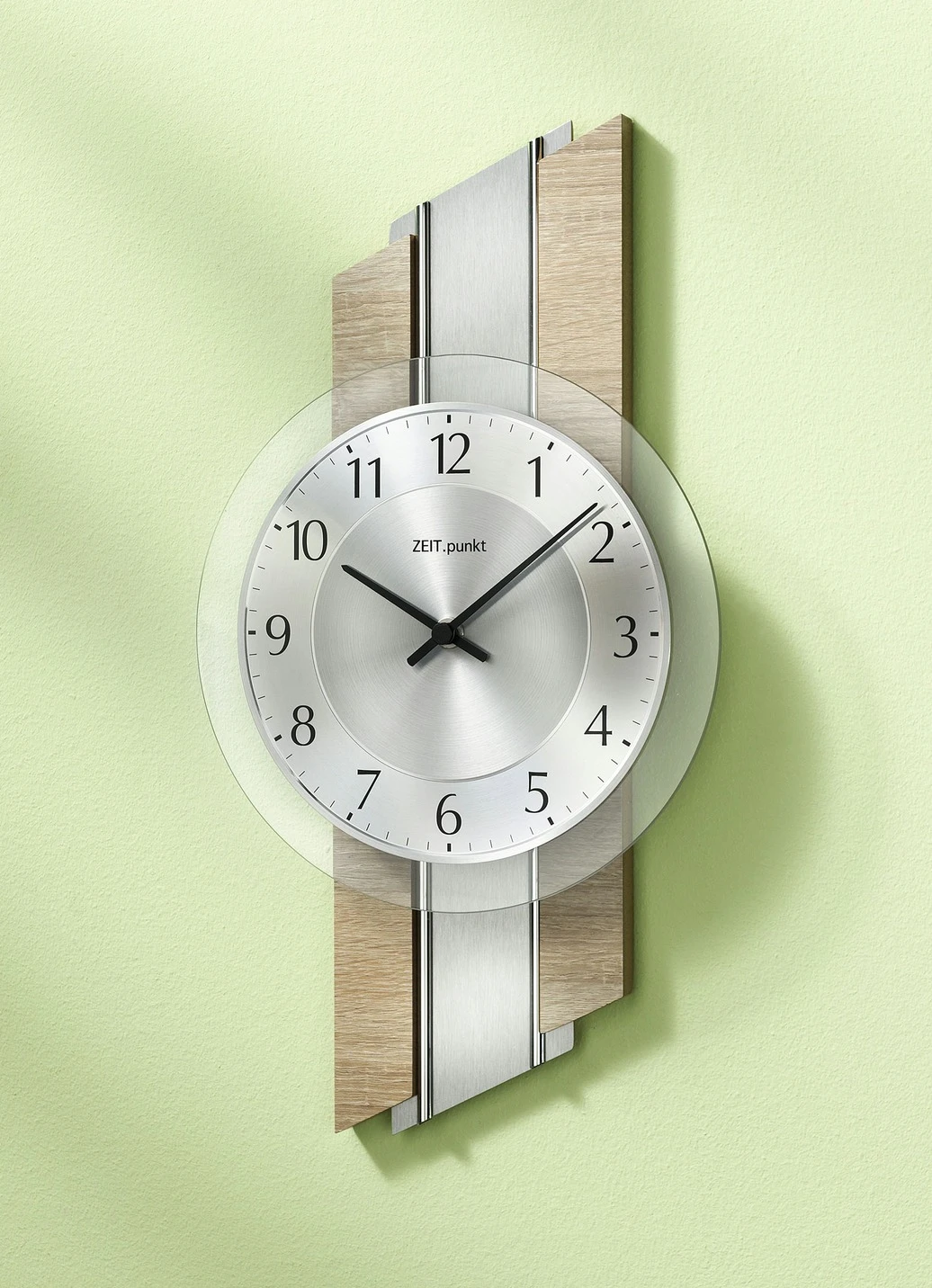 Mit abgeschrägter Rückwand aus Massivholz und mit chromfarbenen Applikationen. Zifferblatt mit facettiertem Mineralglas und einer Aluminium-Auflage mit arabischen Ziffern und schwarzen Zeigern. Quartzwerk, batteriebetrieben mit 1x 1,5 Volt Mignon (nicht im Lieferumfang enthalten).