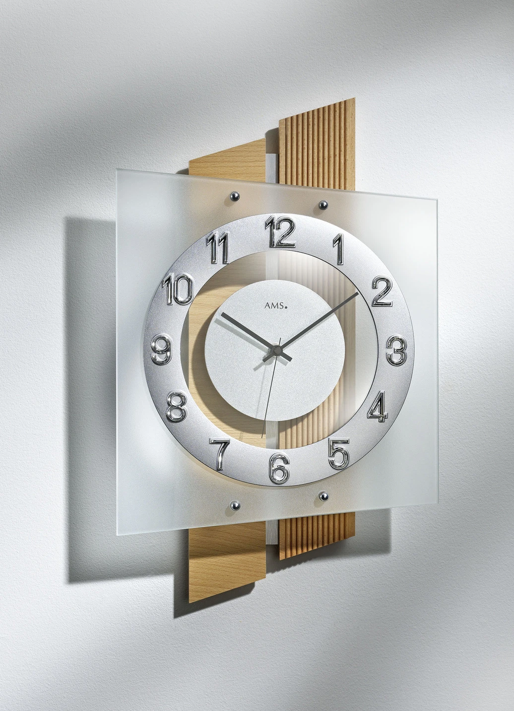 Dekorative in Deutschland gefertigte Wanduhr. Mit abgeschrägter Rückwand aus Massivholz buche. Rundes Zifferblatt aus Aluminium und aufgelegten arabischen Ziffern sowie schwarzen Metallzeigern auf Mineralglas. Hochwertiges Funkuhrwerk. Batteriebetrieben mit 1x 1,5 Volt Mignon (nicht im Lieferumfang enthalten). Maße: B29xH47xT7 cm.