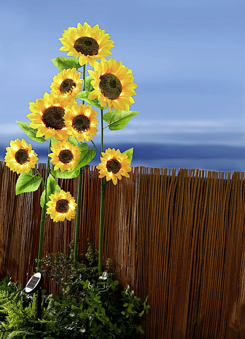 Lassen Sie Ihren Garten mit einem nie verwelkenden und farbenprächtig blühenden Sonnenblumen-Set erstrahlen – dank Solarfunktion auch bei Nacht. Inklusive Erdspieß zur einfachen Verankerung im Boden. Mit Ein- und Ausschalter. Aus Kunststoff und Metall. Maße: Gesamthöhe 80 cm