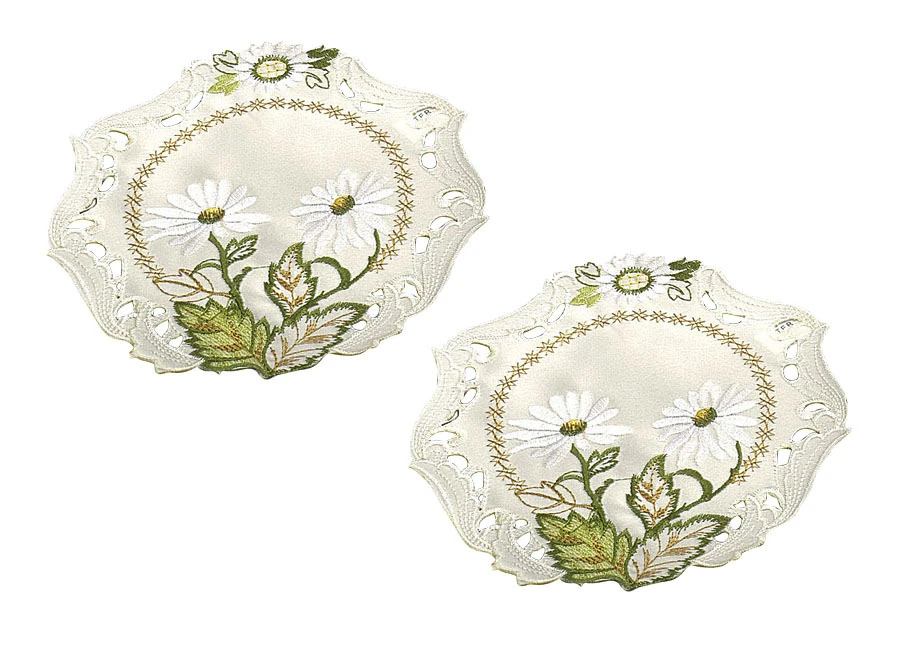 Zarte Gerberas zieren diese Accessoires in Größe 100 (Läufer, 30x 45 cm) und in Ecru-Bunt.