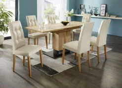 Die schönen Stühle auf Holzbeinen aus massivem Buchenholz zeigen sich mit angenehm gepolsterten Sitzflächen und Rückenlehnen und tollem Kunstlederbezug (100% Polyvinylchlorid). Rücken mit formstabiler Knopfsteppung. Die Lieferung erfolgt aufgebaut.
