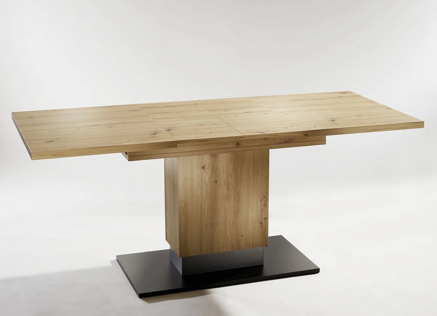 Dieser zeitlos schöne und zudem super zu kombinierenden Esstisch verleiht Ihrem Essbereich ganz neuen Charme! Pflegeleichter und stabiler Säulentisch aus Melaminplatten mit Holzdekor in Artisan Eiche. Bodenplatte schwarz. Die Tischplatte ist dank zwei Synchron-Metallauszügen einfach und leicht in der Mitte ausziehbar. Darunter im Säulengestell sind zwei Einlegeplatten (je ca. 30 cm breit) die eingelegt werden können, dadurch ist der Tisch schnell von 120 cm bis auf gesamt 180 cm vergrößerbar. Mit Aufbau-Anleitung zur einfachen Selbstmontage
